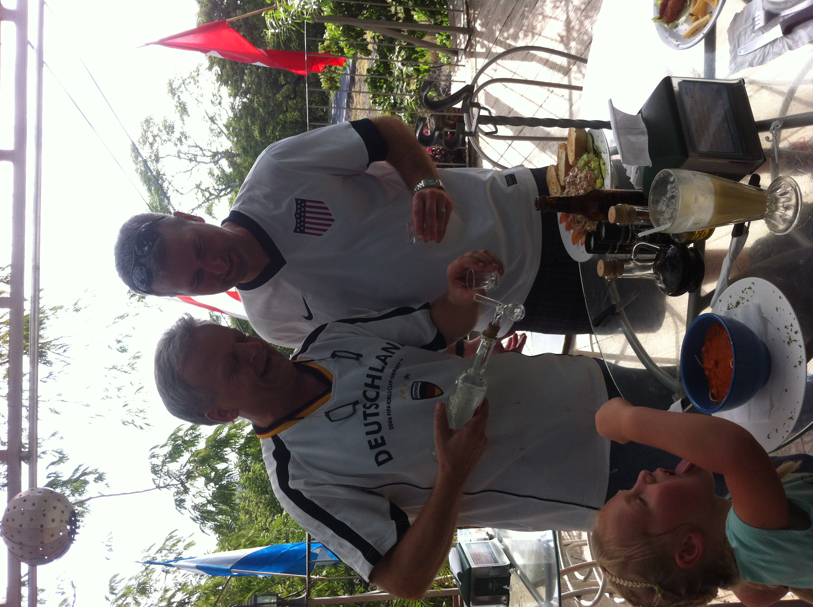 Of course, we weren’t fooling ourselves. We knew that deplaning, customs, baggage pickup, and getting our rental car would take significant time as well. As luck would have it, the game went into overtime which gave us more time to watch it. And, even luckier was that there was a German-owned bar that was showing the game just a km from where we picked up our rental car. We made it out in time to watch the end of the game, join a good crowd of enthusiasts, and celebrate Germany’s win. The owner of the restaurant began handing out shots and cigars after Germany won the game 1-0 during overtime. It was quite an experience!