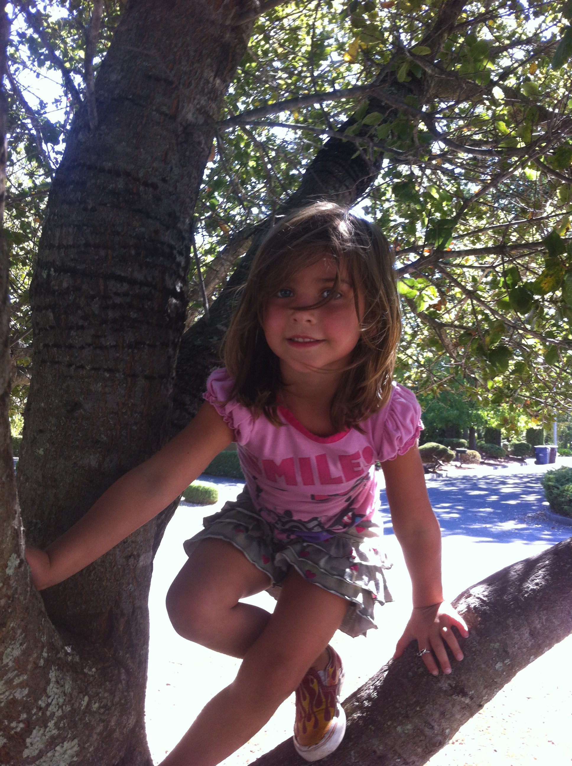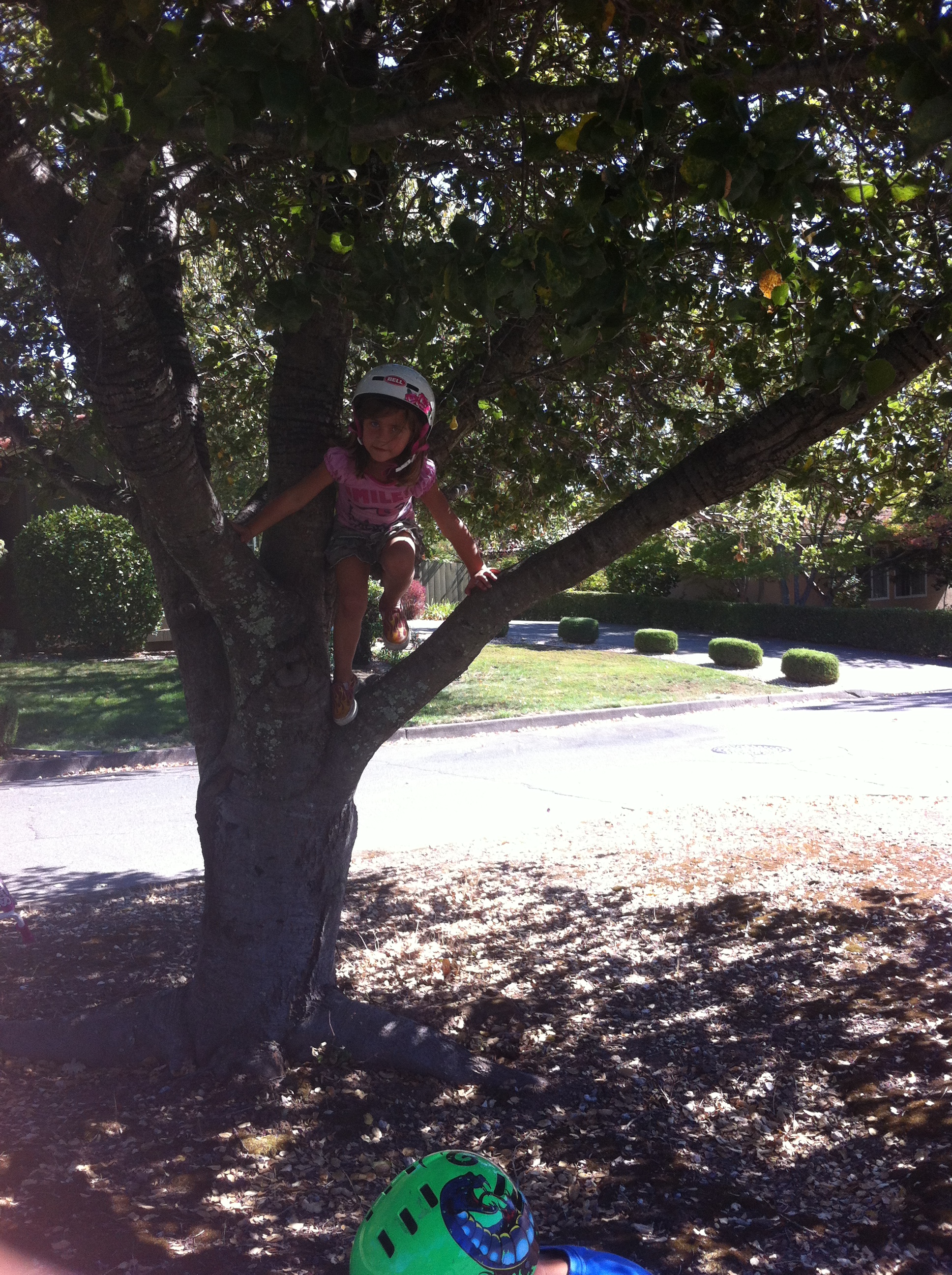 The big kids often like to ride ahead of me on the way home and climb this little tree.