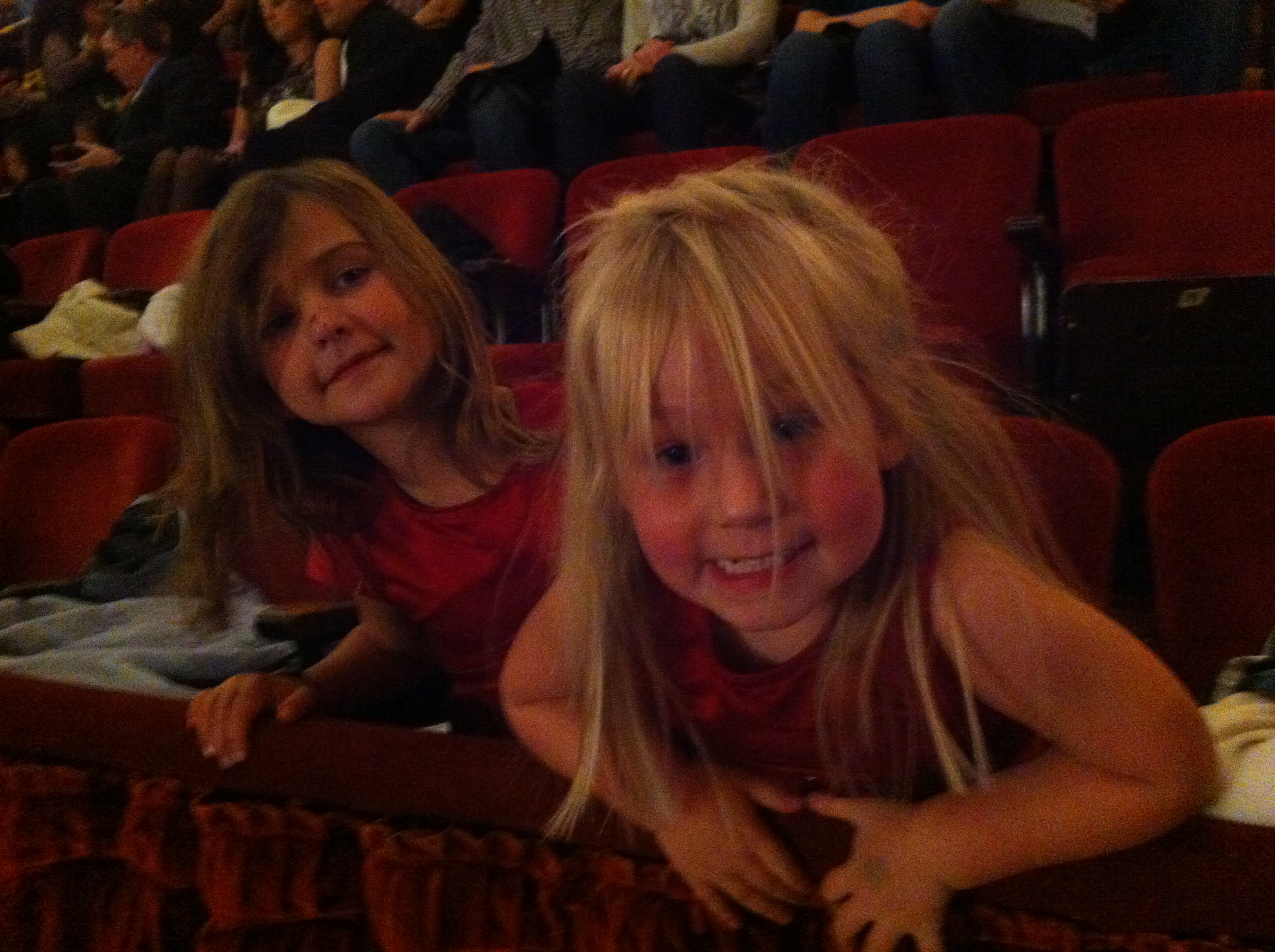 We were up high in the balcony – buying seats for 5 people to watch a show is expensive! –  and we had two seats in front and three in back. Sierra sat on my lap in back for the first half, but during the second half she wanted to be up front with the big kids. We finally worked out that she could share the seat with Aubrey, either side by side or in her lap. They actually partially stood much of the time though – since they had a railing in front of them and us behind them, it didn’t really matter.