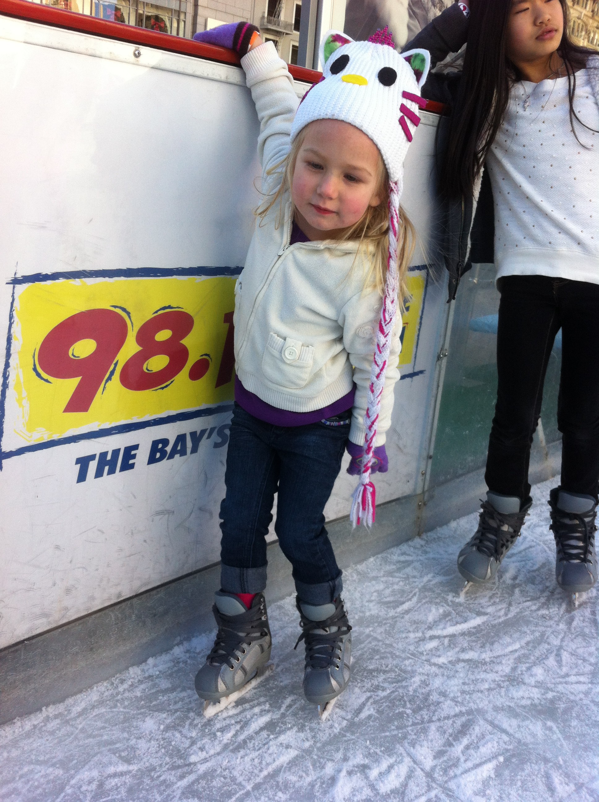 We almost decided against going ice skating after I saw how small and crowded the rink was the night before, but the girls really wanted to go ice skating over anything else we suggested to them to do in the city that day, so we headed back over to Union Square around 10am. I am really glad we did it! It was so much fun ice skating there. Rylan and Aubrey ended up being fine ice skating on their own, without my help, so we were all able to be on the ice at the same time. Tim stayed on the side lines as he’s not an ice skater, he says. I held Sierra’s hands and took her around for the morning skating session. There were mostly families there so it wasn’t too fast of a pace for our kids. The couple times I fell with Sierra (mostly trying not to have her fall and taking the fall myself), there were skaters who worked at the rink there immediately to check on us – which made me feel much safer knowing that if I didn’t see Aubrey or Rylan fall somewhere that they needed serious help or attention, that there was someone else looking out for the skaters.