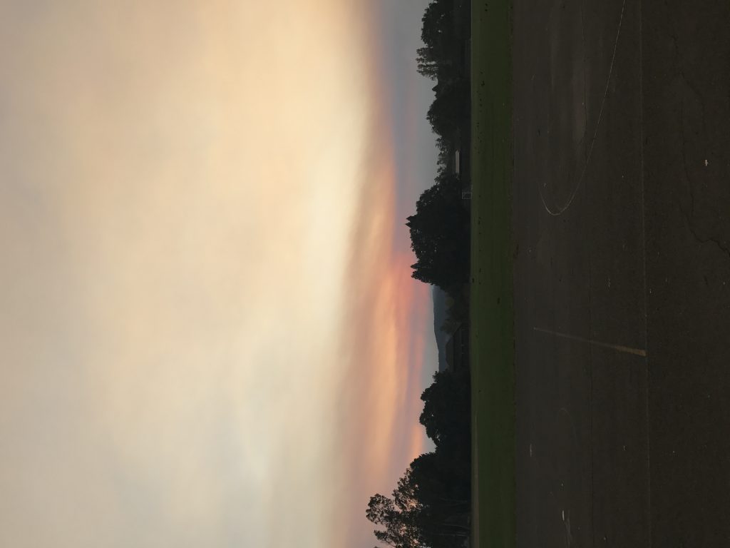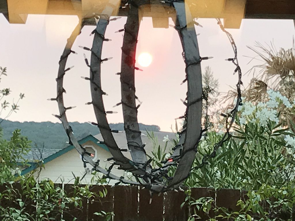 At the high school evacuation center, I was impressed that not only were they already handing out face masks, but they had coffee and food inside for everyone. Friends of ours were out passing out masks, sharing stories. But with our dog, it was difficult to do much there. Our friend texted me that we could come to her house, which was within walking distance. We walked through the school fields, eerily quiet. We could see, even from there, flames in several directions on the hillsides. It was crazy that *this* was considered the safe place when so much was burning all around, but it was nice to trust in others who were committed to the community’s safety. If this was an evacuation center, we reasoned, they weren’t going to let the fire come close – at least without full warnings.