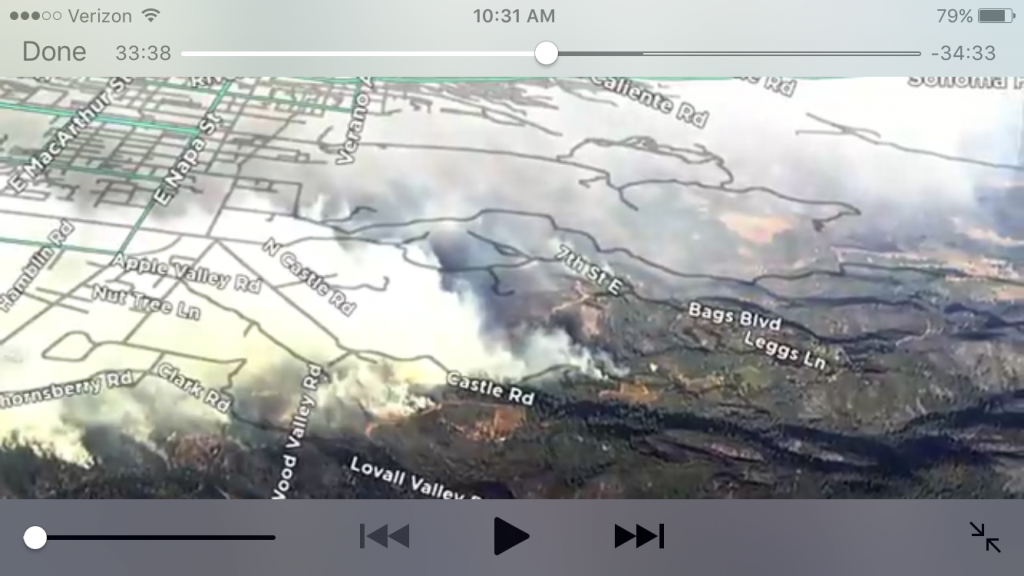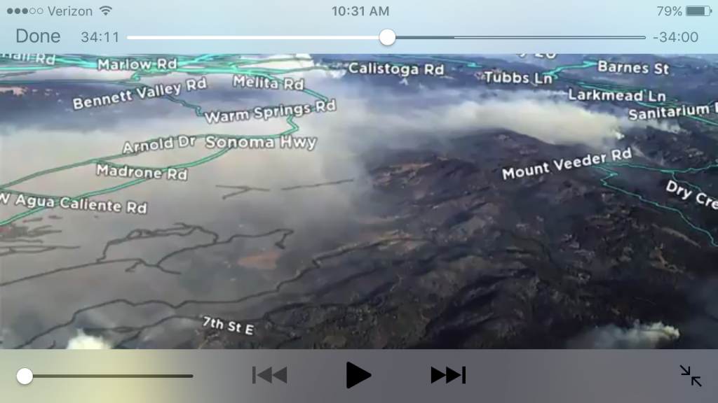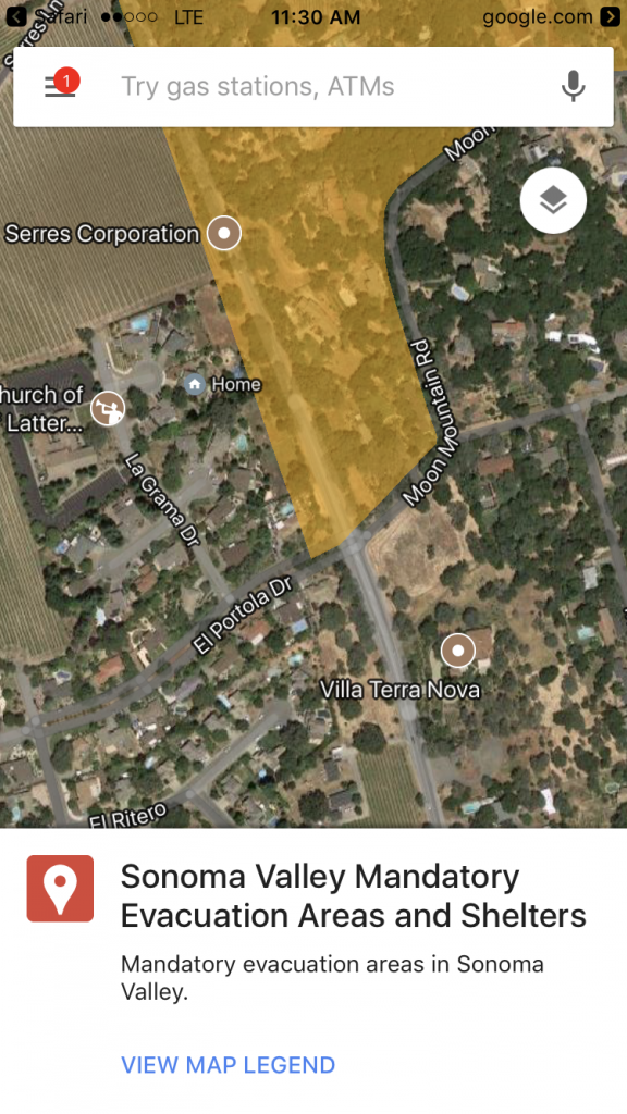 I could barely wait for him to explain the trouble, but what he said was not what I was expecting: “The fires are getting closer. You should plan on getting out of there in the next 10 minutes or so,” he said. I became panicked – “Fires? Are near here?” I asked. He said that the flames were visible from our house. My heart started to race. I tried to get more information, but I the panic was starting to get to me, and I had to leverage it with sensibility. This wasn’t the time to get a full news update – I wasn’t going to get a chance to understand what was going on right then. It was time to get my family safe, right away. Our friend told us the only way out of town was East, and I started putting together what he was saying with the original text asking about my parents, who were in Napa, and realized this was a big deal. But first things first. Flames were visible from our house, we needed to leave.