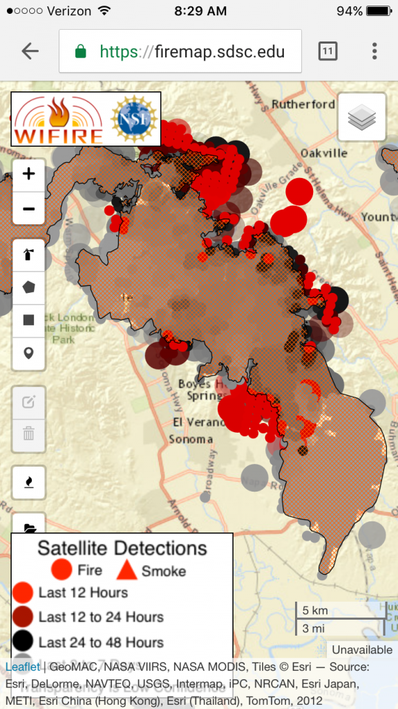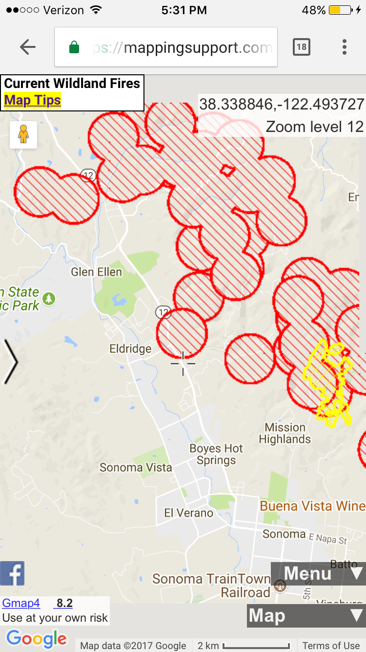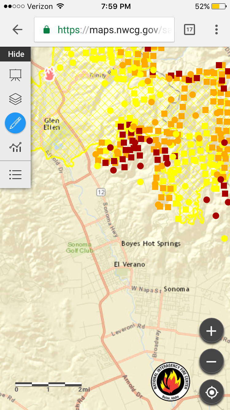Sonoma was saved! The fires merged and over 50,000 acres burned all around the town, as shown in the orange lines on this map.